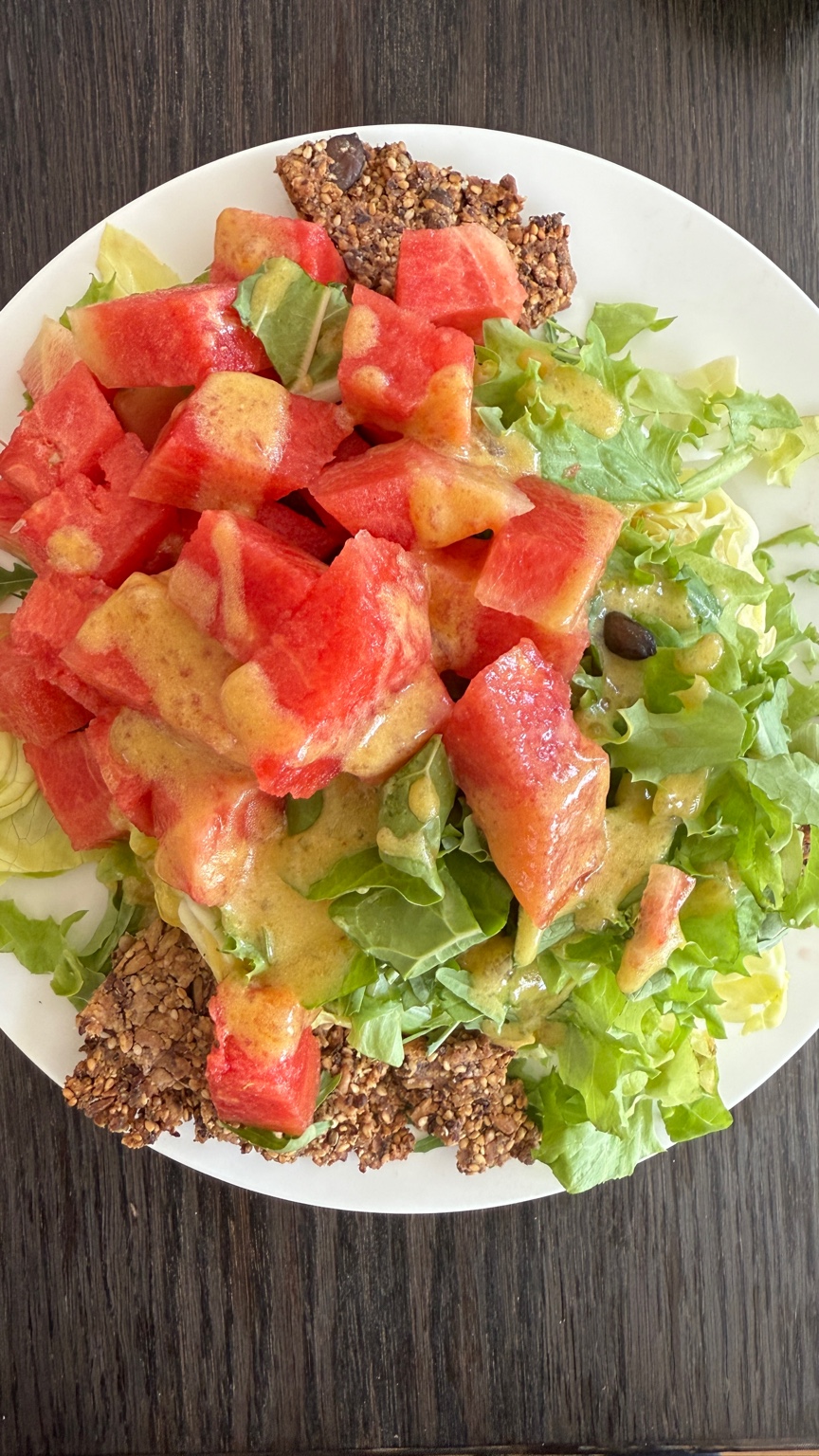 Ein Lunch, der Deinen Körper liebt und Deinen Kopf klärt: Saftige Wassermelone 🍉, zartbittere Blattsalate 🥬, ein feines Senf-Dressing 🥄 und kraftvolle Körnercracker 🌾. Diese Kombination punktet auf allen Ebenen – ob für Detox, Brainpower 🧠 oder einfach guten Geschmack 😋.