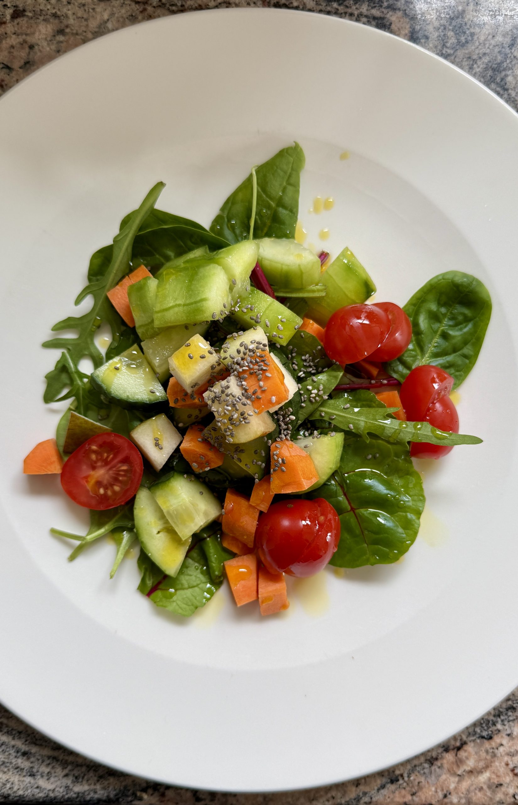 - Salat zubereiten 🥗: Alle Zutaten klein schneiden, mit Leinöl vermengen und mit Salz & Pfeffer würzen.