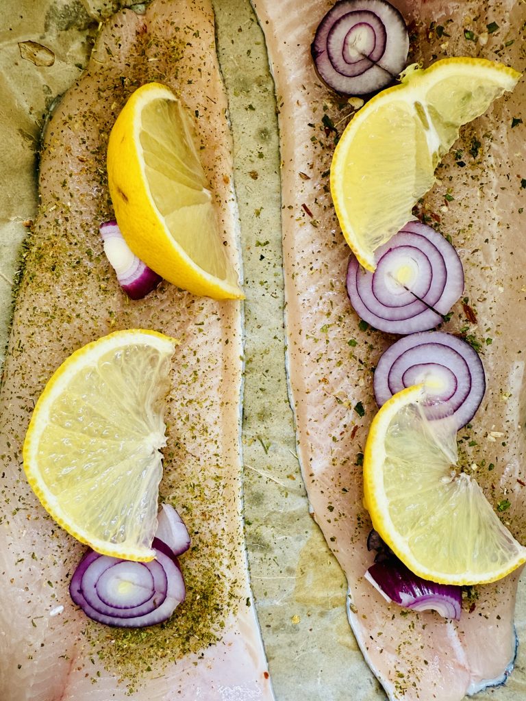 - Forelle marinieren: Die Forellenfilets werden mit Kräutern, Salz, Pfeffer und Paprika gewürzt. Dazu kommen rote Zwiebeln und Zitronenscheiben 🍋.