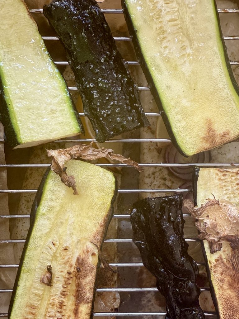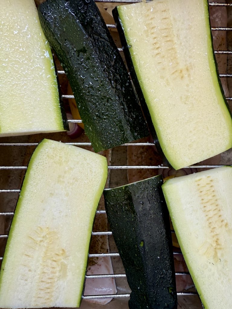 - Zucchini vorbereiten: Die Zucchini wird mit Sonnenblumen- oder Rapsöl 🌻 eingerieben, da diese hitzebeständiger sind als Olivenöl.