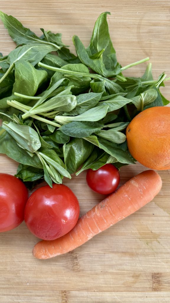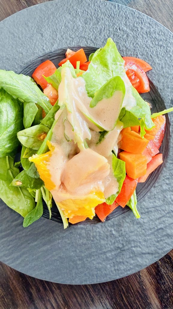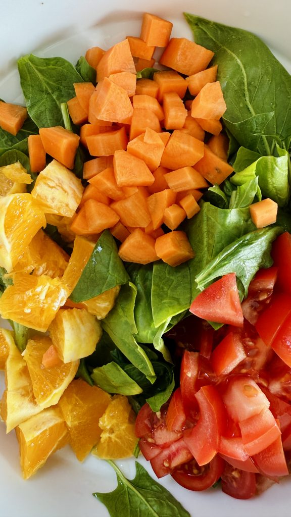Frischer Babyspinat, gewürfelte Tomaten 🍅, Karotten 🥕 und Orangenstücke 🍊 sorgen für Frische. Das Dressing aus Leindotteröl, Joghurt, Senf, Balsamico und Honig wird erst vor dem Servieren darübergegeben.