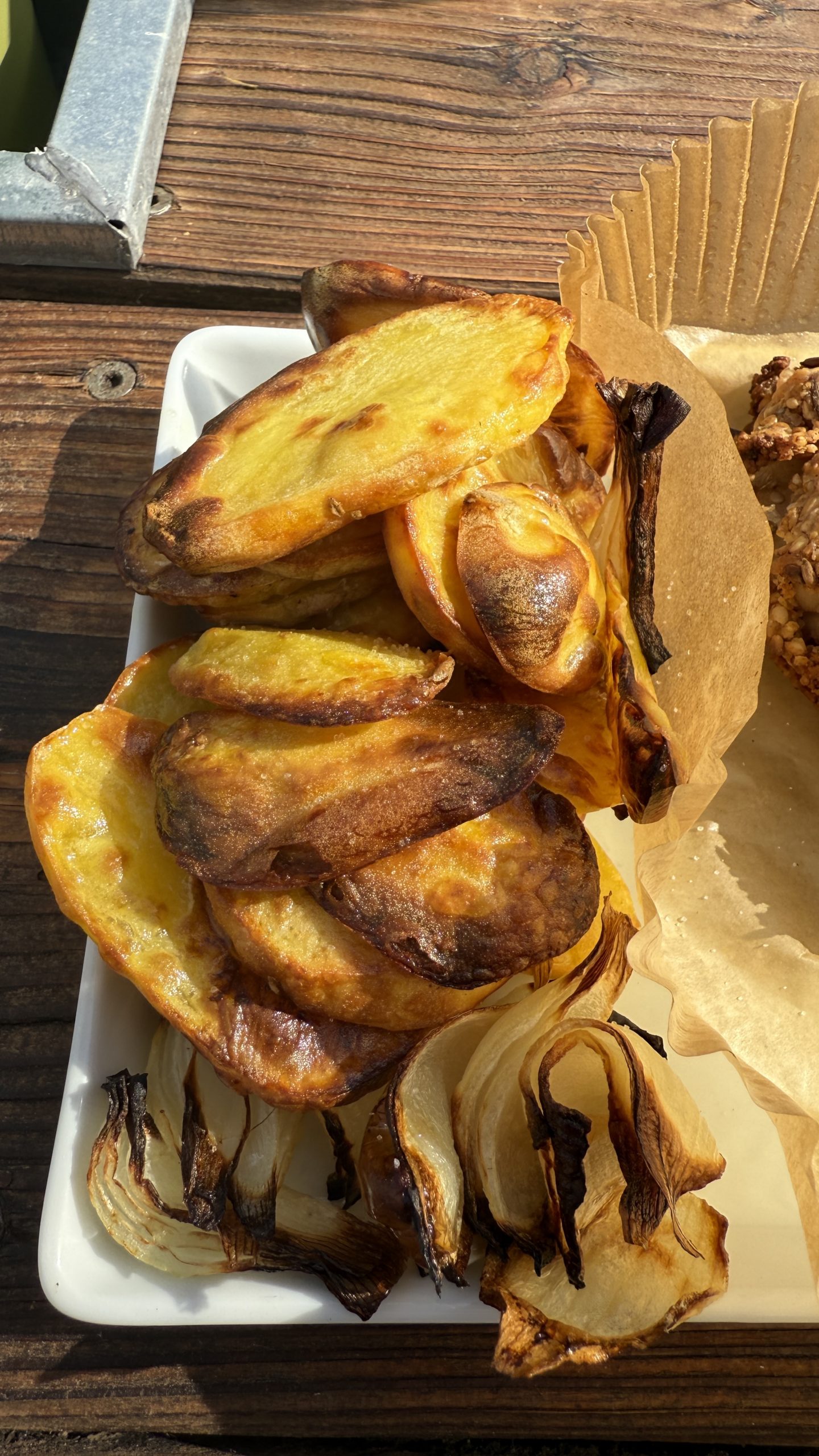 Kartoffeln und Zwiebeln mit Olivenöl und Gewürzen vermengen und in der Heißluftfritteuse (Ninja) bei 200 °C etwa 20 Minuten knusprig rösten.
