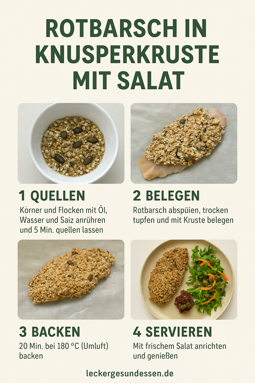 Dieses Gericht vereint das Beste aus zwei Welten: wertvolle Omega-3-Fettsäuren aus dem Fisch und ballaststoffreiche Power-Zutaten aus der Kruste. Die einfache Zubereitung macht es alltagstauglich, der Geschmack hebt es auf Gourmet-Niveau. Wer gesund essen will, ohne auf Genuss zu verzichten, wird diesen knusprigen Rotbarsch lieben – frisch, leicht und vollwertig. Ideal für Deine lymphfreundliche, glutenfreie Küche!