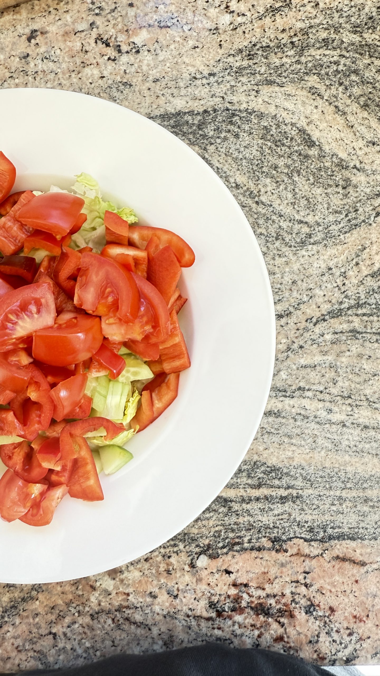 - Salat zubereiten: Tomaten, Paprika, Gurken und Salat in eine Schüssel geben, mit Olivenöl, Zitronensaft, Salz und Pfeffer vermengen.