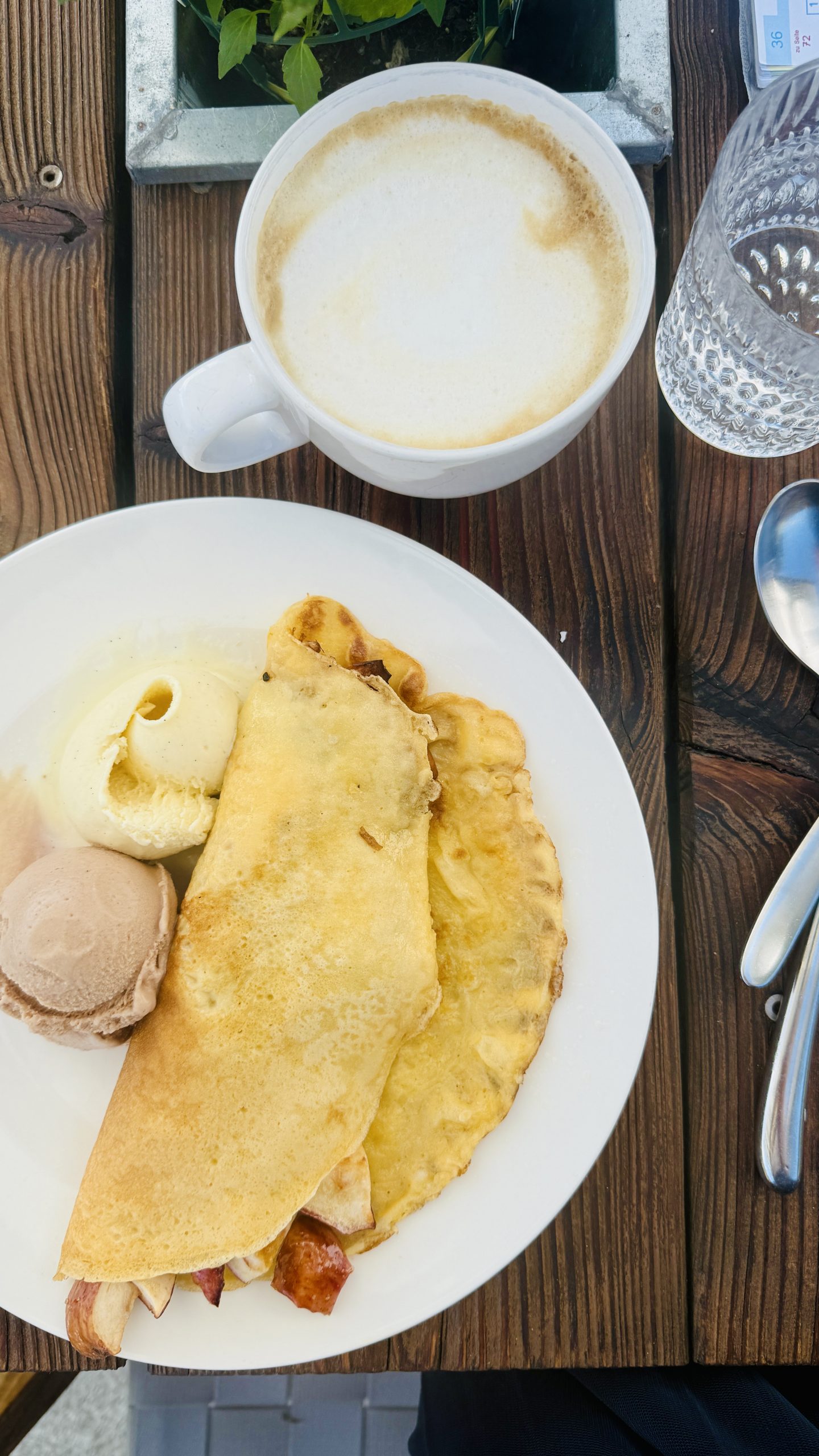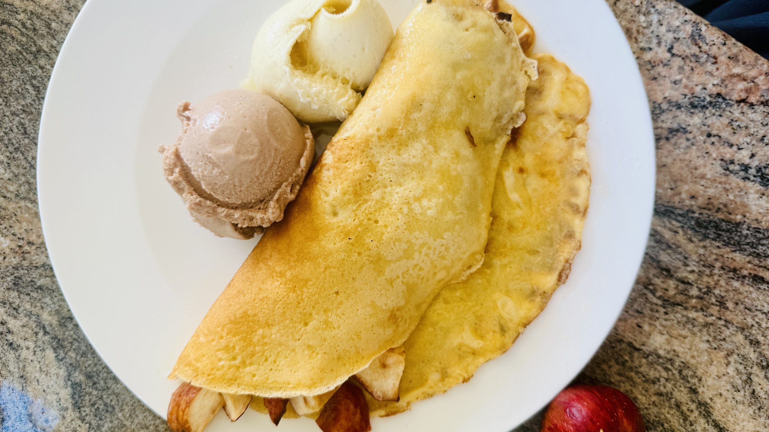 Die Äpfel in die Pfannkuchen füllen, zusammenklappen und mit jeweils einer Kugel Vanille- und Haselnusseis servieren. Direkt warm genießen – der perfekte Genussmoment!