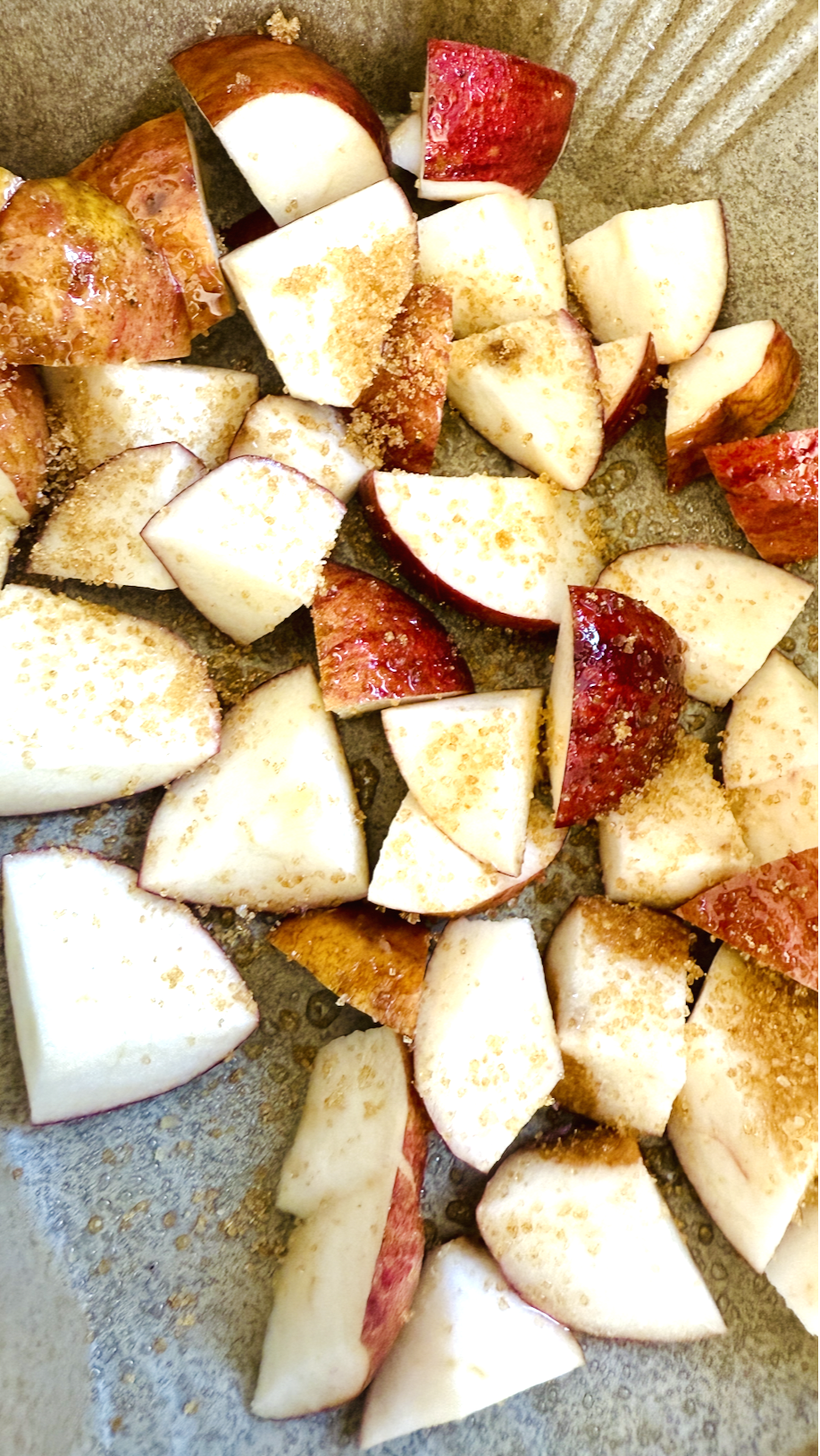 Die Äpfel waschen, entkernen und in Stücke schneiden. Mit Öl und braunem Zucker vermengen und in der Heißluftfritteuse (z. B. Ninja) bei 180 °C ca. 18 Minuten karamellisieren, bis sie weich und goldbraun sind.