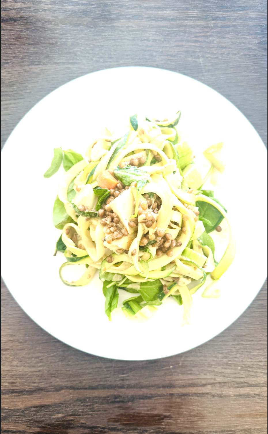 Manchmal entsteht aus Resten das Beste: Diese leichte, vegane „Pasta“ aus Zucchini, Birne, Linsen und cremiger Mus-Soße schmeckt nicht nur fantastisch, sondern tut auch Deinem Körper gut. Ideal bei Wassereinlagerungen oder für eine basenüberschüssige Ernährung – und dabei absolut alltagstauglich. Die Kombination aus süßlich-zartem Gemüse, milden Linsen und einer nussig-exotischen Sauce ist ein echter Gamechanger in der lymphfreundlichen Küche! 💚
